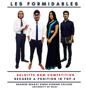 2. National Finalist at Deloitte GSM Case Competition 2020 - Gurpreet S. Chandok (B.Com Hons 3rd Year), Simran Chopra (B.Com Hons 3rd Year), Yash Khandelwal (2nd Year), Aaradhya Bansal (B.Com 2nd Year) as a team 'Les Formidables' made it to the finals by clearing four rounds consisting of the Finance test, Aptitude Test, and two case study rounds and made it into the Top-5 Positions across India.